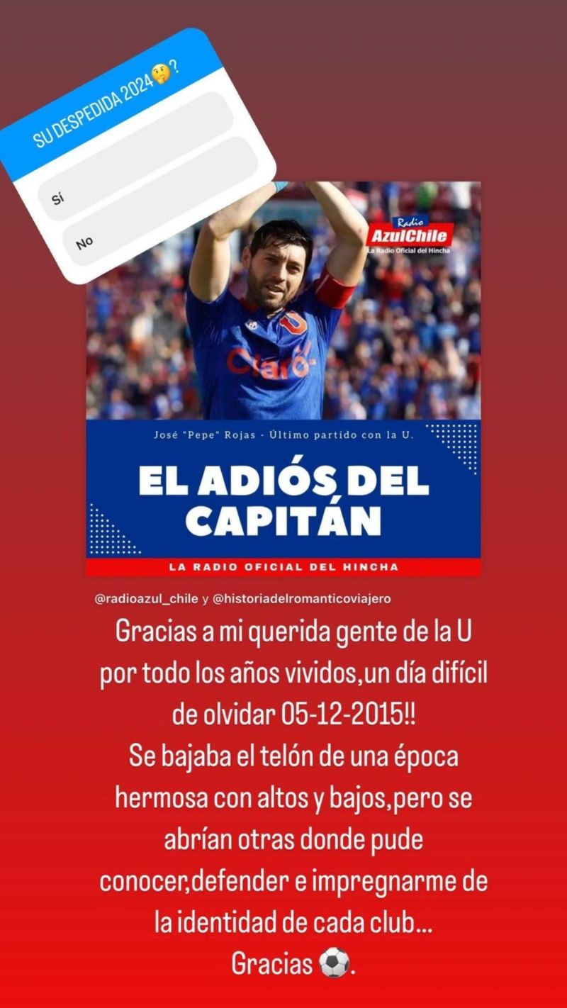 “Gracias a mi querida gente de la U por todos los años vividos. Un día difícil de olvidar. Se bajaba el telón de una época hermosa con altos y bajos, pero se abrían otras donde pude conocer, defender e impregnarme de la identidad de cada club. Gracias”, fue el mensaje con el que Pepe Rojas acompañó la publicación de su último partido con la Universidad de Chile.