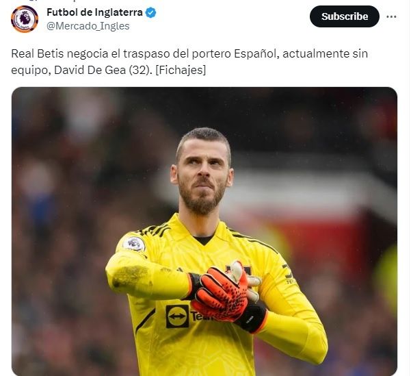 De acuerdo a información del portal Fichajes: “Real Betis negocia el traspaso del portero Español, actualmente sin equipo, David De Gea”. Y es que con 32 años no se cerró su traspaso para el fútbol de Arabia, por lo que el Real Betis quiere buscar la oportunidad de incorporarlo, aprovechando que no tiene que pagar cláusula de salida.