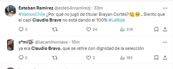 En el entretiempo, las críticas de los hinchas chilenos en redes sociales se dirigieron específicamente hacia dos jugadores. Claudio Bravo, con sus 40 años, es señalado por una actuación que dista de sus mejores días, especialmente tras su reacción en el segundo gol de los galos.